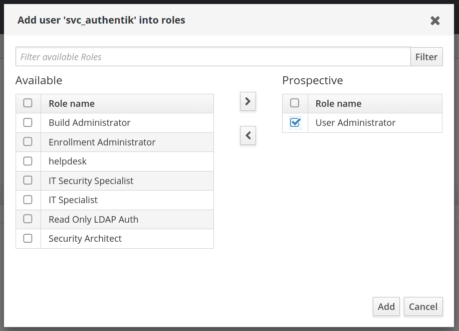 4. Add a role that has privileges to change user passwords, the default User Administrators role is sufficient. This is needed to support password resets from within authentik.